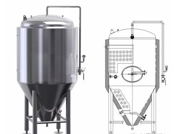 (1)底部為錐形便于生產(chǎn)過程中隨時(shí)排放酵母,要求采用凝聚性酵母。圓錐底的夾角一般為60o~80o,也有90o~110o,但這多用于大容量的發(fā)酵罐。發(fā)酵罐的圓錐底高度與夾角有關(guān),夾角越小錐底部分越高。一般罐的錐底高度占總高度的1/4左右,不要超過1/3。圓錐底的外壁應(yīng)設(shè)冷卻層,以冷卻錐底沉淀的酵母。錐底還應(yīng)安裝進(jìn)排污口、出酒口、溫度傳感、制冷夾套等。罐的直徑與高度比通常為1:2~1:4,不能太高,以免引起強(qiáng)烈對(duì)流,影響酵母和凝固物的沉降